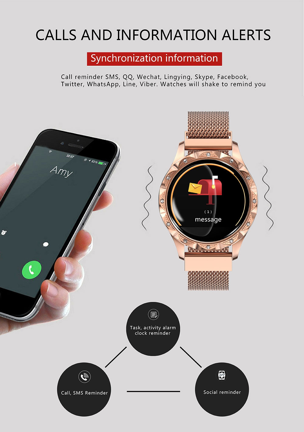 Nova generacija bolj posebnih in zmogljivih ur na trgu, polna čara in pripravljena, da izstopa na ženski roki. Klasična okrogla oblika bo z elementi presenečenja vabila prijateljičine poglede.Ne samo LEPA, ampak tudi PAMETNA ;) Ima inteligentni sistem za sledenje ženskih fizioloških sprememb: Sistem vodi in in napoveduje/sledi fiziološkim spremembam v ženskem telesu (v kolikor v uro vpisujemo čas menstruacije). Opominjanje na obdobja, menstruacije - varnostna doba - obdobje ovulacije - jajčni dan, fiziološko stanje je vidno na uri, tako da boste imeli pomembne informacije vedno pri roki, vaše življenje pa bo bolj urejeno, zapiski pa redni.- Velik 1.04-palčni TFT zaslon. - Magnetni pašček. - 24 urno neprekinjeno zaznavanje srčnega utripa in shranjevanje podatkov v aplikaciji. - Test krvnega tlaka. - Prikaz časa, štetje korakov, poraba kalorij, prehojena razdalja, kvaliteta spanca. - Možnost uporabe ure kot daljinski upravljalec za slikanje s telefonom. - Vklop / izklop zaslona z dvigom roke. - Možnost določanja različnih športnih načinov, za bolj točno in kvalitetno merjenje podatkov (tek, košarka, nogomet, hoja v hrib, hitra hoja). - Nadzor mirovanja (čas spanja, kakovost spanja) - Klicni opomnik, opomnik SMS, opomniki za različne aplikacije, kot so Facebook, Skype, Twitter,... - Poiščite telefon in poiščite uro - Find My Phone - Budilka / opomniki za jemanje zdravil / opomniki za sestanke / opomnik za dolgoročno sedenje / opomnik za hidracijo (pitje vode). - Kvalitetno merjenje srčnega utripa in krvnega tlaka z dvojnim senzorjem. - Daljinski upravljalnik (potresi za fotografijo).Certifikat: CE, RoHS, FCC, MSDS Možna sinhronizacija z Android in Apple preko priložene aplikacije.Specifikacije: Sistem Android: različica Android 4.4 in iOS 8.0 ali novejša Čip: HRS3300 Senzor: BST-BMA253 CPU: NRF52832 Velikost zaslona: 1,08 palca Ločljivost zaslona: 240x198 pixel Kapaciteta baterije: 110mAh Povezava: Bluetooth V4.0 Čas polnjenja: 3h Vodotesni nivo: IP67 Garancija: 1 leto 841100721C 841100721C https://www.etuizamobi.si/media/catalog/product/cache/1/image/9df78eab33525d08d6e5fb8d27136e95/8/4/841100721C_1000x1000_1.jpg