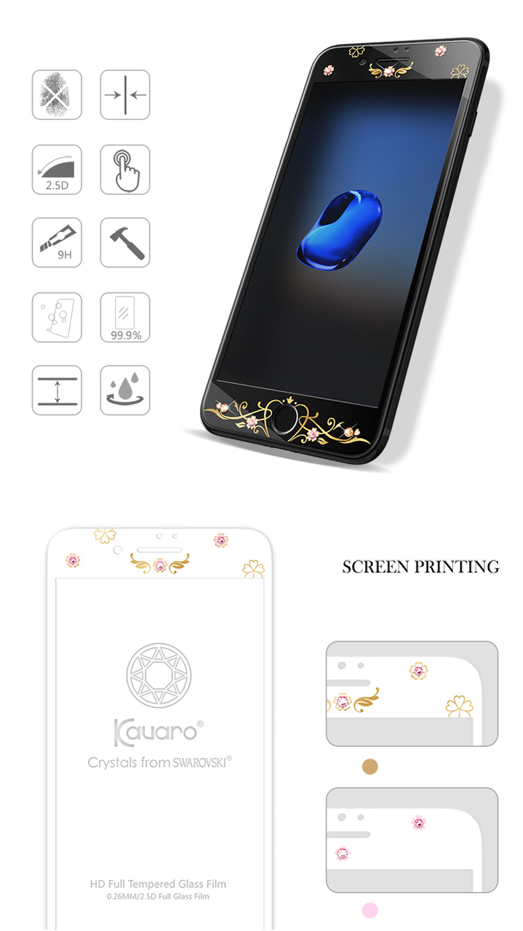 KAVARO KALJENO STEKLO SWAROVSKI BLACK KRONE - APPLE IPHONE 7 PLUS / IPHONE 8 PLUS Steklo je ukrivljeno, zato prekriva celotno sprednjo stran (in ne le ekran)!- Narejeno je iz kemično obdelanega pravega stekla, zato je dobro pregledno, visoko občutljivo z lepim občutkom na dotik - Napredna tehnologija z visokokakovostnim tiskom poskrbi za lep dizajn - Steklo iz kaljenega premiuma ima poseben premaz, ki preprečuje ohranjevanje prstnih odtisov in drugih onesnaževalcev - Varnostna funkcija anti-eksplozije bo ob razbitju poskrbela, da se bodo drobci držali skupaj in tako ohranili ekran telefona nedotaknjen - Ščiti tudi pred odrgninami hkrati pa ohranja izjemno visoko vizualno ločljivost - 2.5D ukrivljeni lok edge tehnologije poskrbi, da je steklo gladko in varno na dotik. - Trdota površine: 9H - dodani Swarovski elementi