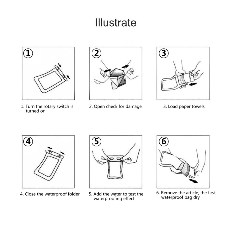 - Pred uporabo priporočamo test v vodi brez naprave, da se preveri vodotesnost, kljub temu da je artikel pred pošiljanjem preverjen. Preverite tako, da v etui vstavite papirnati robček, etui zaprete in ga potopite v vodo. Po nekaj minutah preverite, robček mora ostati suh.